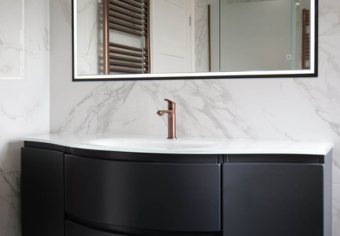 To create a feeling of openness, we installed a large, single-glass basin cabinet, which features custom-sprayed storage and bronze taps. This matches the beautiful freestanding bath and hand shower. The striking bronze vertical radiators tie the whole look together, adding both warmth and a strong design statement.
